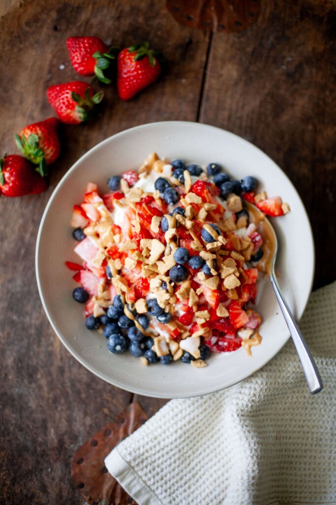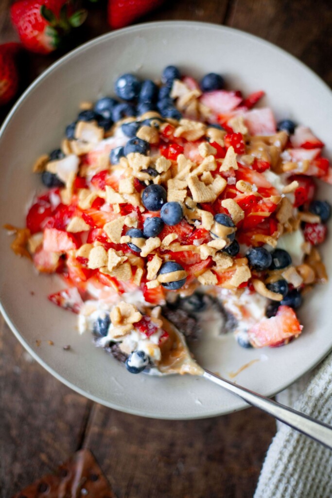 - The toppings are nonnegotiable for me. This is how I actually build my bowl: 150g square of the bake, ½ cup (120 g) nonfat or low-fat Greek yogurt (sweetened with a few drops of liquid Stevia. You can also use already sweetened vanilla Greek yogurt like Oikos triple zero), 20g of my favorite dairy-free whipped cream, 120g strawberries (diced small), 30g blueberries, 10g natural peanut butter (store it in the pantry instead of the fridge so it will drizzle!), 10g of crushed cinnamon toast Catalina crunch, and then I love to finish with a couple of tablespoons of my favorite Nut Pods almond milk creamer, and a good pinch of flake salt. I often even pour a bunch of almond milk over the top, but maybe that’s just me!Of course, you’ll log all of your toppings separately! But once you get it right, save it as a meal in your tracking app so that you can just log the same thing every time.