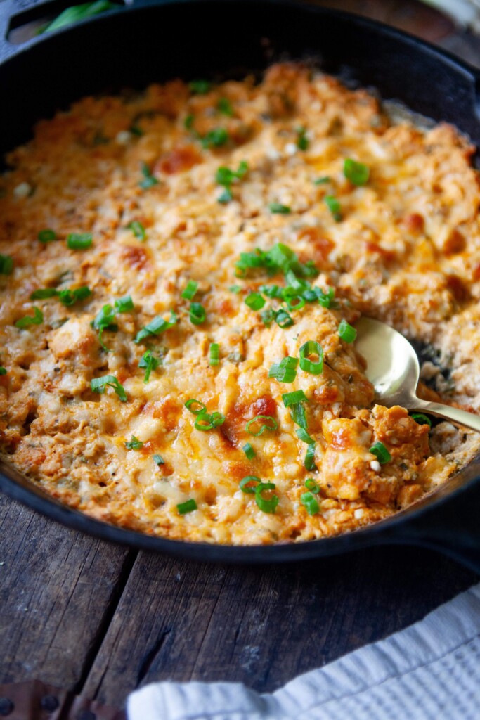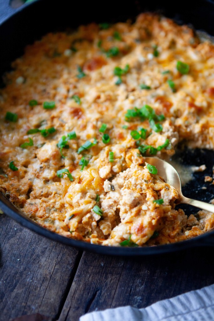 - Combine everything together in a bowl, with the exception of half of the grated cheese. Spread it into a shallow baking dish or cast iron skillet. Top with the remaining grated cheese and bake for 25 minutes or until browned and bubbly. If needed, you can broil for the last 2-3 minutes for more color on top. Top with an extra pinch of green onions for garnish and a drizzle of buffalo sauce if you like!
