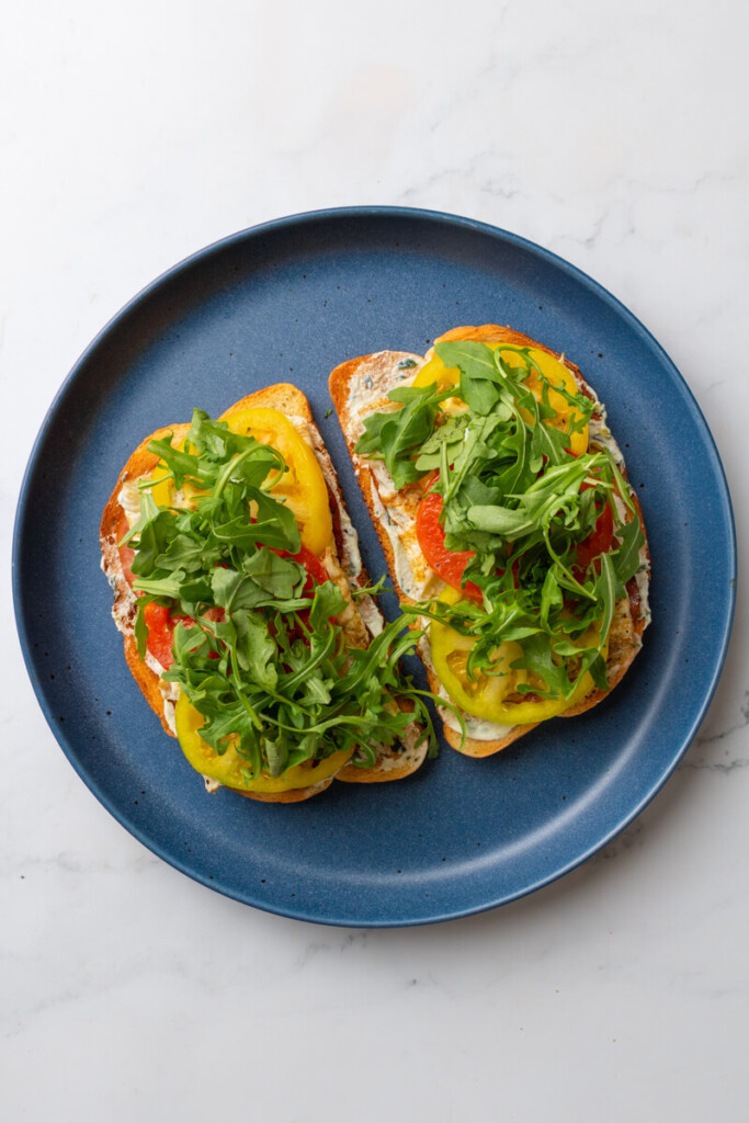 6. Finish with some sliced tomato and a pinch of arugula. Add additional good salt, pepper, and/or a little red pepper flakes to taste.