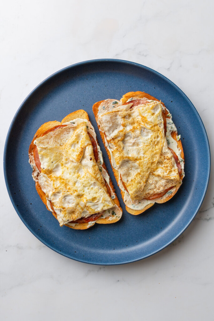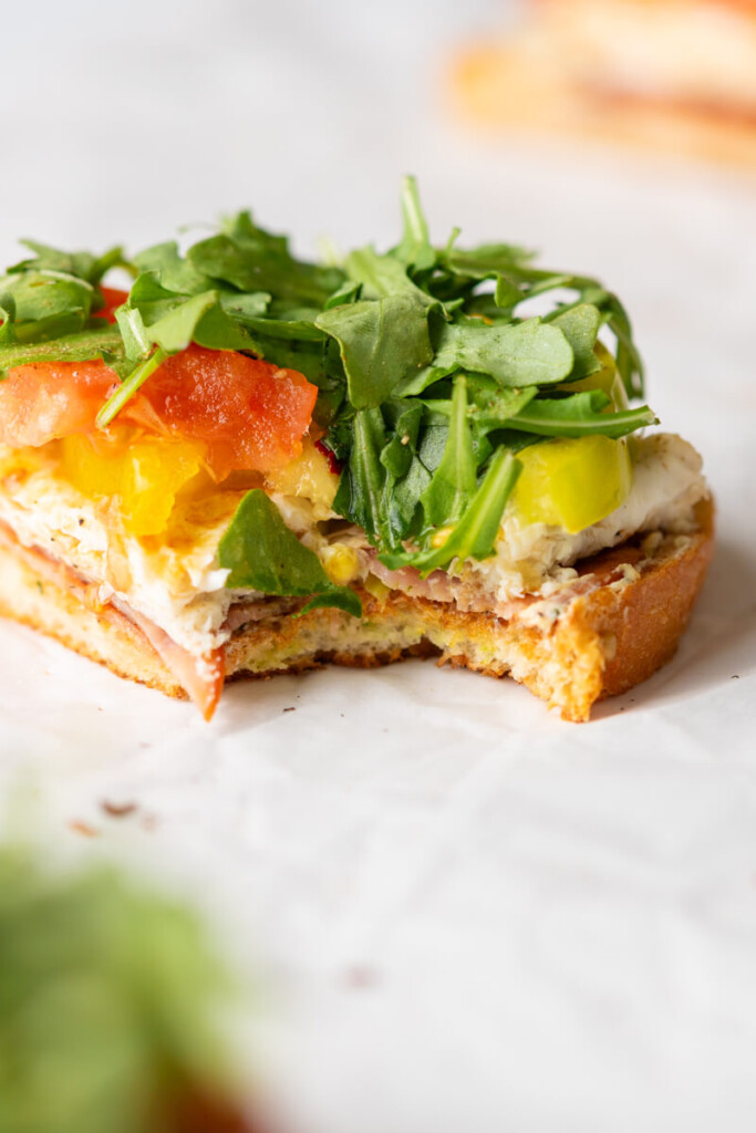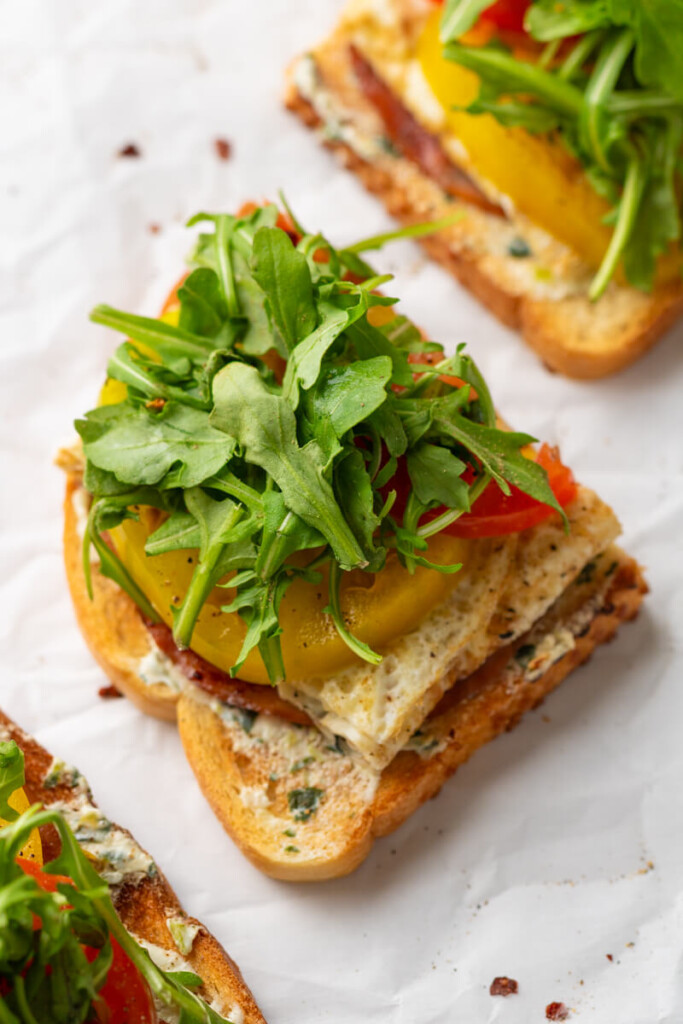 - Toast your bread and top with basil yogurt, ham, and a layer of fried egg whites. Finish with some sliced tomato and a pinch of arugula. Add additional good salt, pepper, and/or a little red pepper flakes to taste.