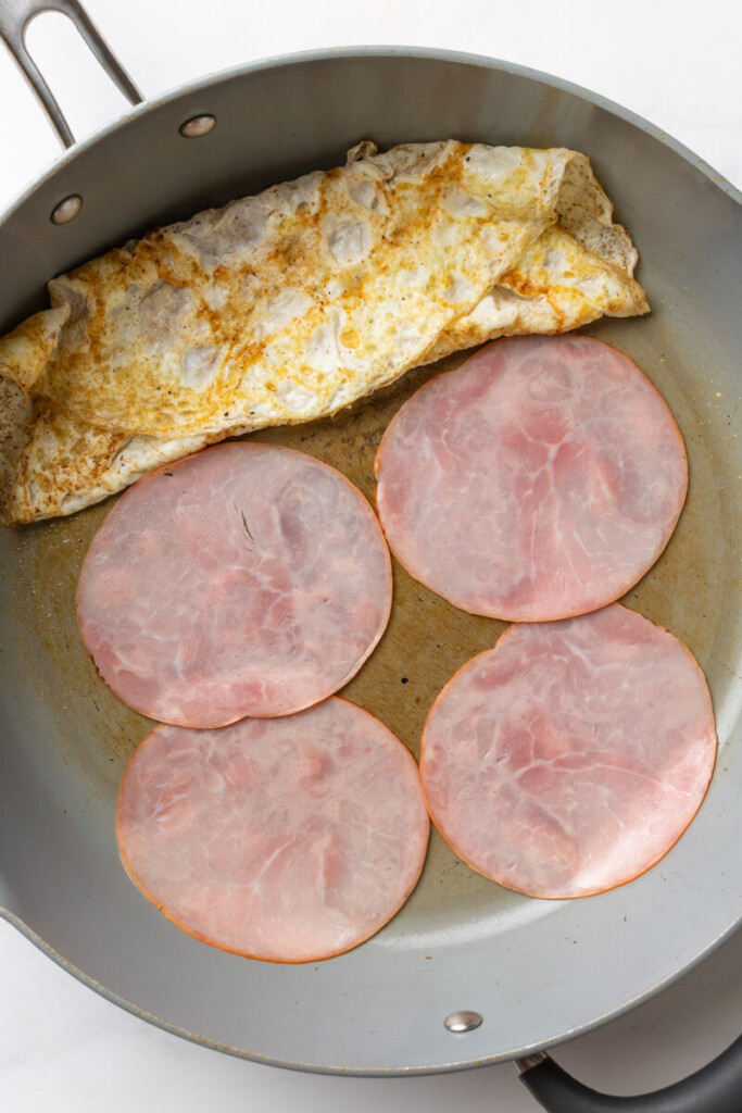 2. Add another spritz of oil to the open half of the pan and wait a few seconds to make sure it’s very hot. Add your ham to the pan to heat it up for about a minute.