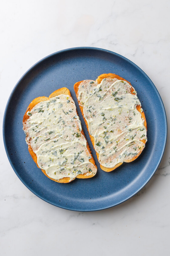4. Toast your bread and spread the basil yogurt in a thin layer.